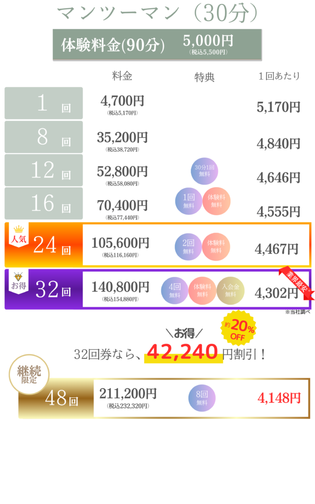 1回〜48回チケットや月額制プランから、目的に合わせた最適なプランをご提案します。